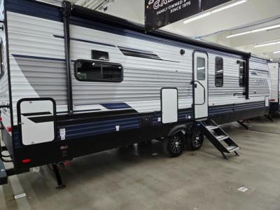Sleeps 4 Slides 2 Length 35 ft 6 in Ext Width 8 ft Ext Height 11 ft 3 in Hitch Weight 840 lbs GVWR 9263 lbs Dry Weight 7763 lbs Cargo Capacity 1500 lbs Fresh Water Capacity 43 gals Grey Water Capacity 70 gals Black Water Capacity 35 gals Furnace BTU 5100 btu Available Beds King Refrigerator Type 12V Black Glass Refrigerator Size 11 cu ft Shower Size 40" Number of Awnings 1 Water Heater Capacity 6 gal Water Heater Type Gas/Electric AC BTU 13500 btu Awning Info 21' Electric with LED Lights Axle Count 2 Washer/Dryer Available Yes Shower Type Shower w/Seat Electrical Service 50 amp Similar Travel Trailer Floorplans